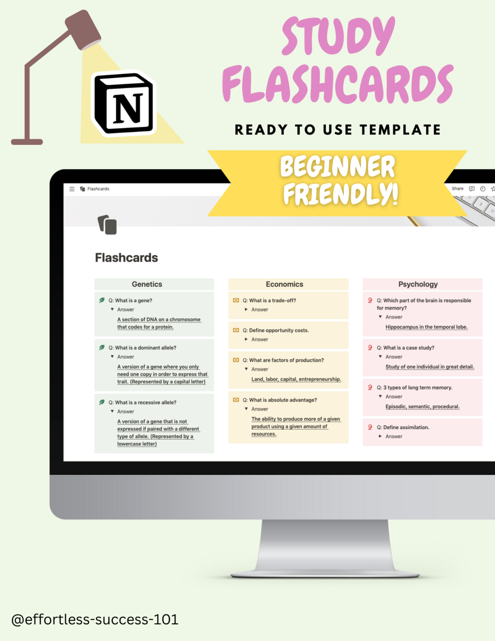 This Notion Template is a simplified and FREE version of my Study Flashcards designed to help you ace those exams. Create a space that is organized and always in reach. Let me show you!